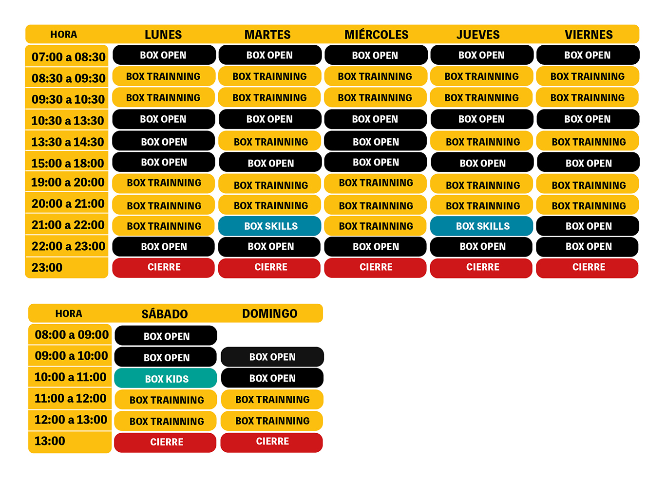 HORARIOS DE FUNCIONAMIENTO LUNES A VIERNES de 7:00 a 23:00 hrs.SÁBADOS de 08:00 a 13:00 hrs. DOMINGOS de 09:00 a 13:00 hrs.